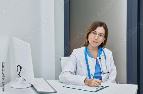 Portrait of general practitioner woman wearing doctor's coat sitting in her workplace office at medical clinic. Doctor's consultation