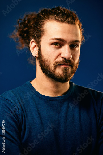 Portrait of gorgeous caucasian bearded hipster in blue shirt standing in front of blue background and having serious facial expression.
