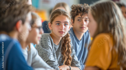 Portrait of group students engaging in debate session in school, discussing topics, education. Diversity and conversation for future development.