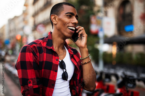 Portrait of handsome african man using electric bike in the city. Happy young man using the phone.
