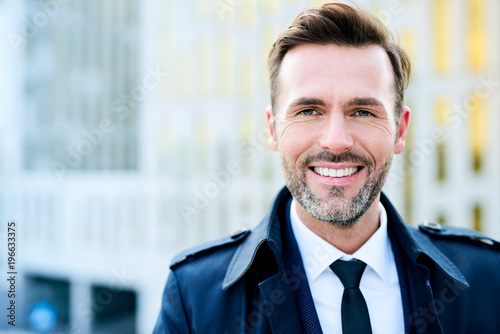 Portrait of handsome businessman looking at camera and smiling outdoors