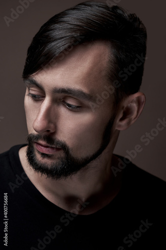 Portrait of handsome caucasian man with beard and stylish haircut in black clothes posing on brown background isolated in studio, fashion model lowering eyes