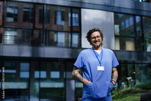 Portrait of handsome doctor in uniform outdoors. Work-life balance of healthcare worker.