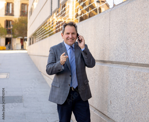 Portrait of handsome middle aged smart businessman walking in the city talking on mobile phone