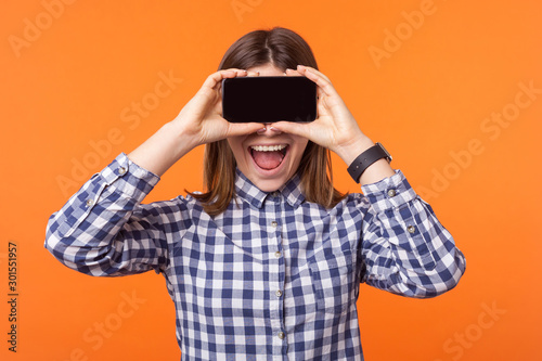 Portrait of happy amazed woman with toothy smile and brown hair wearing checkered shirt standing, hiding her eyes with cellphone, taking pictures. indoor studio shot isolated on orange background