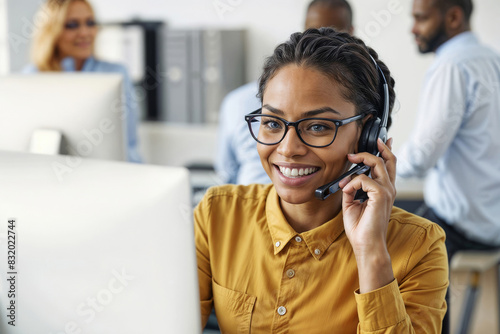 Portrait of happy beautiful African American woman customer service operator talking on phone in office. Telephone sales service