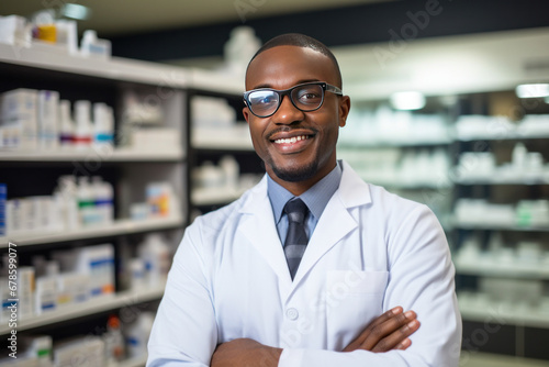 Portrait of Happy Confident Black Pharmacist Wearing Lab Coat and Glasses, Crosses Arms and Looks at Camera Smiling Charmingly in a pharmacy store.