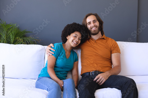Portrait of happy diverse couple sitting on sofa embracing and smiling