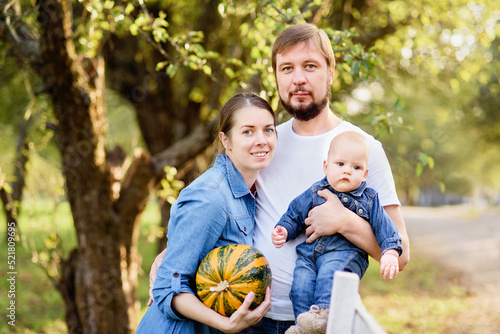 Portrait of Happy family hugging and spending time together outside in green nature. Young mother and father with little baby in garden. Apple harvest and picking on farm in autumn.