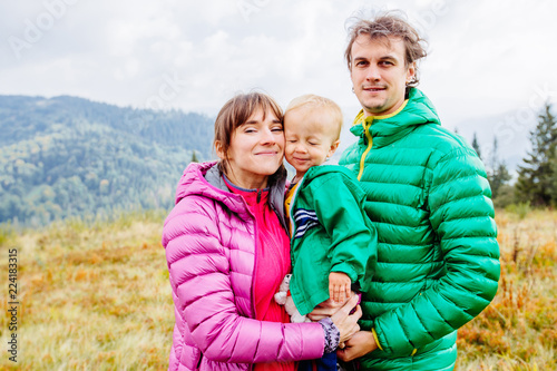 Portrait of happy family mother, father and toddler son wearing colorful duck jacket are traveling on Carpathain mountains. Traveling with children, tourism and people concept. Copy space.