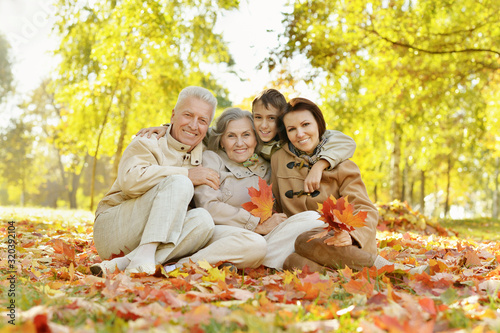 Portrait of happy family relaxing in autumn forest