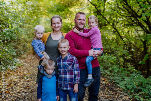 Portrait of happy family with kids in a forest.