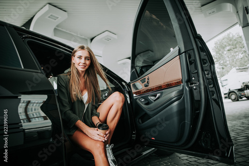 Portrait of happy female drinking cup of delicious liquid while locating on seat of car with opened door