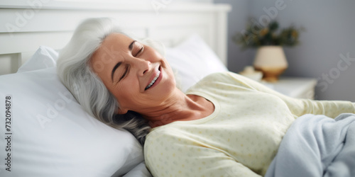 Portrait of happy fresh beautiful senior woman waking up after healthy sleep in cozy comfortable bed