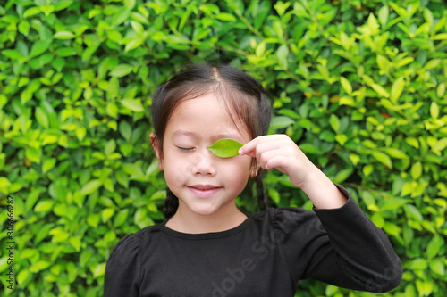 Portrait of happy little Asian child girl holding a green leaf closing left eye in green garden background.