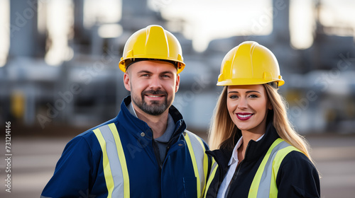 Portrait of happy male and female engineer at oil refinery, wearing construction helmet and vest, engineer couple