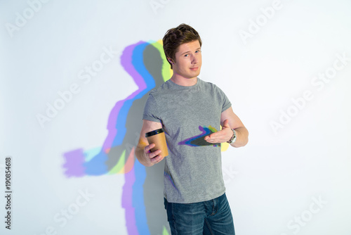 Portrait of happy man standing with colorful shadow pointing at mug of delicious beverage. Rest concept