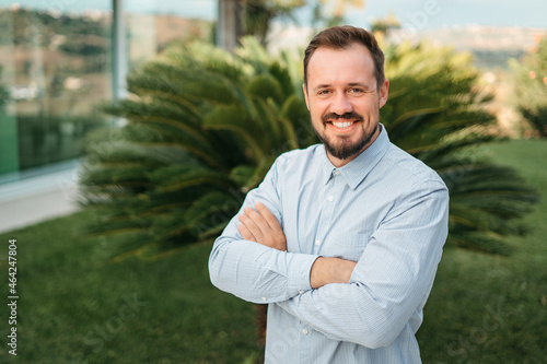 Portrait of happy mature man looking at camera outdoor. Senior businessman with beard feeling confident at sunset. Closeup face of business man smiling with city in background.