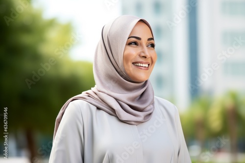 portrait of happy muslim woman in hijab looking at camera outdoors