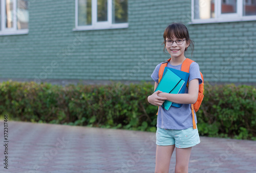 Portrait of happy schoolgirl with backpack and notebooks isolated on a school yard