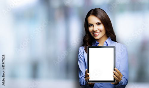 Portrait of happy smiling brunette businesswoman showing mock up blank tablet pc, touchpad, blurred modern office interior background. Confident young business woman indoors.