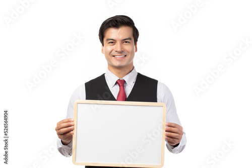 Portrait of happy smiling young businessman showing blank signboard with copyspace for text isolated on white background.