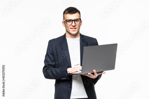 Portrait of happy young businessman using laptop standing over white background.