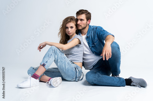 Portrait Of Happy Young Couple Sitting On Floor Leaning Against Wall