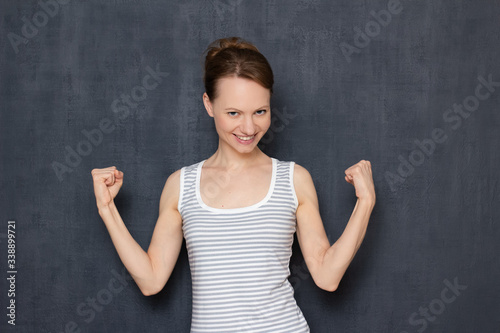 Portrait of happy young woman raising fists up, rejoicing at victory