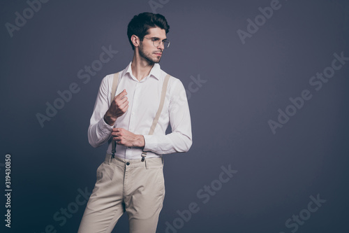 Portrait of his he nice attractive imposing elegant luxurious focused brunette man macho fixing button looking aside posing isolated on grey pastel color background