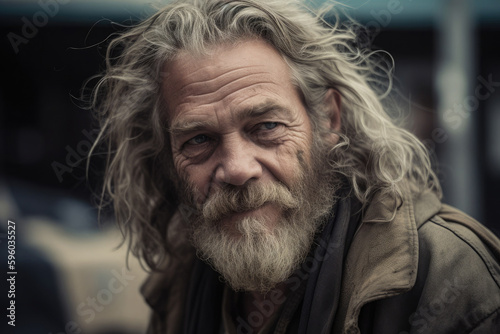 Portrait of homeless man, close up. Tramp on city street. Bearded, wrinkled man. Social inequality. Created with Generative AI