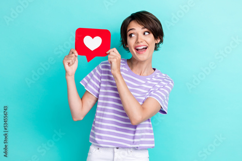 Portrait of impressed excited ecstatic pretty girl wear striped t-shirt holding looking at like isolated on turquoise color background