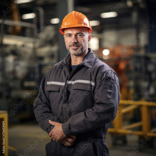 Portrait of Industry maintenance engineer man wearing uniform and safety hard hat on factory station.