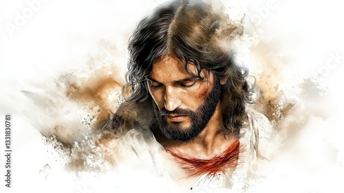 Portrait of Jesus Christ: A Powerful and Sacred Illustration of Faith, Spirituality, and Devotion in Christianity. Digital watercolor illustration