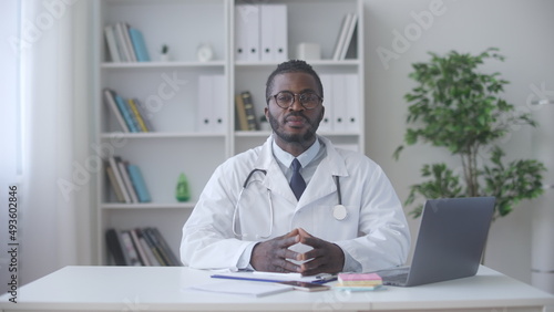 Portrait of kind African-American doctor in eyeglasses sitting at table and smiling
