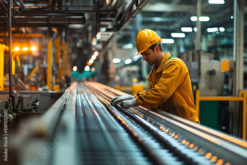 Portrait of labor in assembly line factory, Selective focus worker stand near conveyor belt in industrial factory.