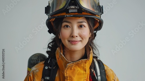 Portrait of laughinghard firefighter korean woman looks in camera. professional costume at isolated background