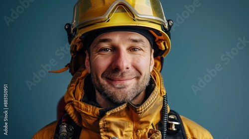 Portrait of laughinghard firefighter white man looks in camera. professional costume at isolated background