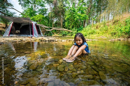 Portrait of little asian girl sitting in nature water near tent while going camping in nature park