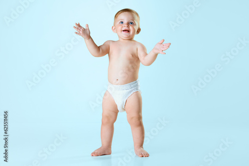 Portrait of little baby girl, toddler in diaper standing and clapping hands against light blue studio background. Cheerful. Concept of childhood, newborn lifestyle, happiness, care. Copy space for ad