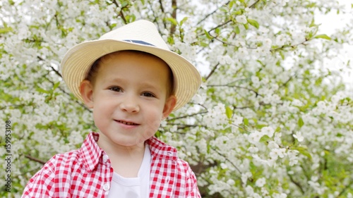 Portrait of little boy in the spring garden. Blooming tree on the background