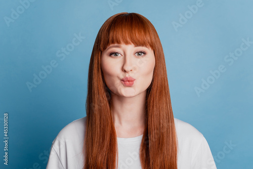 Portrait of lovely sweet girl blowing air kiss isolated on blue background