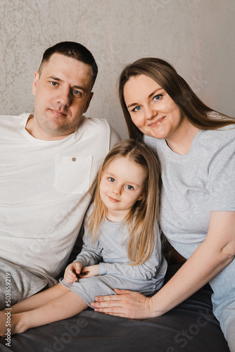Portrait of loving family with infant daughter. Happy caucasian family of three people. Selective focus. Film grain