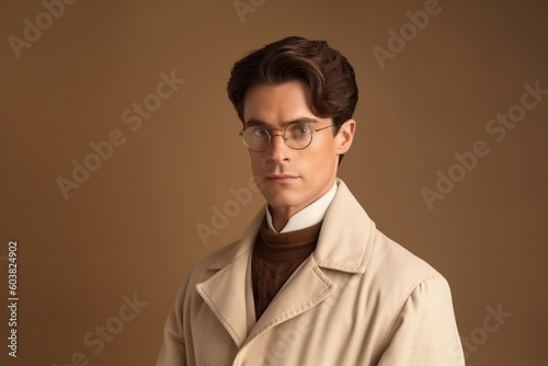 portrait of male doctor in 19th century in Victorian era in coat on beige background, created with Generative AI Technology