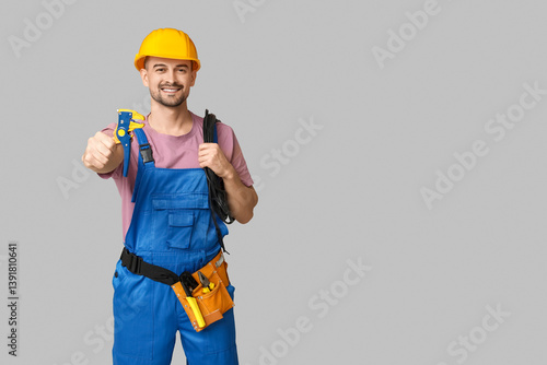 Portrait of male electrician with crimper and wires on grey background