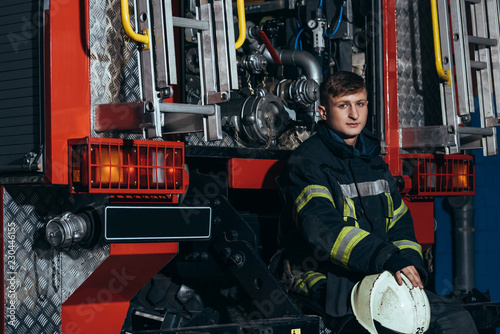 portrait of male firefighter with protective helmet in hands at truck at fire department