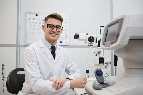 Portrait of male optometrist smiling at camera while posing at workplace by optic equipment, copy space