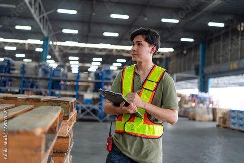 Portrait of male staff with holding clipboard working in warehouse, Industrial and industrial workers concept.
