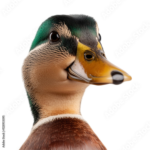 portrait of mallard duck with a green head and brown body, isolated on a transparent background