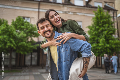 Portrait of man and woman piggyback with love in the city on a walk